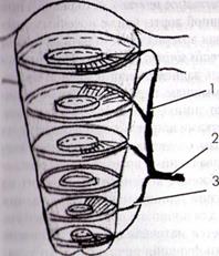 щветви маточной артерии кровотечения из разрыва шейки мат- ки может и не быть, что затрудняет диагностику этого вида пато- логии без осмотра шейки матки с помощью зеркал в ранний пос- леродовой период. После отдачи нисходящей ветви основной ствол маточной артерии поднимается вверх у нерожавших женщин в виде прямого ствола на расстоянии 0,5-1,0 см от ребра матки, а у рожавших - извиваясь и плотно прилегая к боковой поверхности органа. Восходящие ветви маточной артерии (ramus ascendens а. uterina) отдают по 18-20 ответвлений к передней и задней стен- кам матки, соединяющимся между собой по средней линии. Из рис. 18 становится понятно, почему при корпоральном кесаре- вом сечении кровопотеря намного больше, чем при операциях выполняемых в области перешейка матки. В области перешей- ка, немного выше места отхождения ramus descendens от основ- ного ствола a. uterina, артериальные ветви I, II, III и IV порядка размещаются горизонтально, и здесь на матке расположена ма- лососудистая зона, в области которой лучше всего производить поперечный разрез во время операции кесарева сечения. В обла сти ниже от вну треннего зева артериальные ветви, отходящие от ramus descendens a. uterina, направляются под острым углом вниз и во внутрь шейки матки, поэтому здесь необходимы дугообраз ные разрезы вершинои