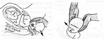 напряжения промежности (рис. 85, 86). Тог, кто принимает роды, независимо в каком поло- жении находится женщина, кла- дет руку ладонной поверхнос- тью на промежность таким обра- зом, чтобы четыре пальца плот- но прилегали в области левой, а сильно отведенный большой па- лец — в области правой срамных губ, а складка между большим и указательным пальцами распо- ложилась над ладьевидной ям- кой. Осторожно нажимают кон- цами всех пяти пальцев на мяг- Рис. 82. Прекращение проти- к и е ткани, расположенные сна- водействия прорезыванию ло- р у ж и и в д о л ь больших срамных бика головки плода (по Бумму) r y 6 j с т я г и в а ю т их к н и з у _ в на- правлении промежности, уменьшая тем самым ее напряжение в области задней спайки. Одновременно ладонь этой руки при- держивает промежность, осторожно прижимая ее к головке, которая прорезывается. IV момент — регулирование ногуг. Когда головка во время потуги вставилась в половую щель своими теменными буграми, акушер обеими руками придерживает ее продвижение и предла-
