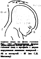 ную, а почковидную форму с двумя наружными линиями: вы- пуклой — АБ, вогнутой — ВГ (рис. 107) и одной внутренней - ДЕ, которая соединяет подбородок с затылком, имеет дугообраз- ную форму, выпуклой стороной повернута к большому роднич- ку, проходит через середины поперечных размеров, идущих от выпуклой к вогнутой стороне (рис. 108). Во время родов в пере- днем виде затылочного предлежания "линия головной кривиз-