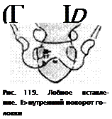 I момент: вставление и разги- бание головки II степени (рис. 118). Головка вставляется в попе- речный размер плоскости входа в малый таз, где происходит ее раз- гибание II степени до верхнечелю- стно-паритального или большого косого размеров. В таком состоя- нии головка проходит плоскость широкой части малого таза, оста- навливается в узкой части, где про- исходит дополнительное измене- ние ее формы. После этого голов- ка опускается на тазовое дно. II момент: внутренний поворот головки (рис. 119). В плоскости выхода из малого таза происходит внутренний поворот головки из поперечного, через косой в прямой Рис. 118. Лобное вставле- ние. Разгибание головки II степени Рис. 119. Лобное вставле- ние. Внутренний поворот го- ловки размер таким образом, чтобы доб разместился спереди, а заты- лок отошел кзади. При этом лобный шов поворачивается к лон- ному сочленению, а затылок - к крестцу и копчику. Если го- ловка плода поворачивается затылком кпереди, то дальнейшее