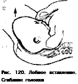Лобное предлежание и вставление головки диагностируется при наружном акушерском исследовании на основании высоко- го стояния дна матки, очень больших размеров предлежащей ча- сти. При влагалищном исследовании при этом виде патологии можно отметить, что головка вставилась в поперечный размер плоскости входа в малый таз, предлежит лоб с лобным швом, спе- реди от них пальпируется переносье и надбровные дуги, а сзади — передний угол большого родничка. Роды при лобном вставлении возможны лишь тогда, когда жен- щина имеет широкий таз и плод
