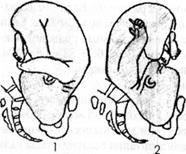 Рис. 135. Сгибание головки при по- перечносуженном тазе: 1 — пере- дний вид; 2 — задний вид жет размещаться возле лобка (передний вид) или возле мыса (задний вид). После преждевременного или ран- него отхождения околоплод- ных вод при относительно большом прямом размере таза происходит высокое прямое вставление стрело- видного шва. Передний вид этого вставления благопри- ятный для родов. Задний вид прямого вставления сагит- тального шва более опасный для женщины, если не произойдет внутренний поворот головки. Если степень уменьшения поперечного размера очень большая, то головка вставляется в прямой размер плоскости входа в малый таз частями, стреловидный шов прижимается к костям таза, возника- ет косой асинклитизм или клинически узкий таз, что требует опе- ративного родоразрешения. Date: 2015-08-06; view: 566; Нарушение авторских прав |