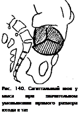 ковом сочленении и головка не может разогнуться. Ошибку вра- чей можно исправить двумя способами: 1) если плод живой, ло- мается крестцово-копчиковое сочленение; 2) при интранаталыюй гибели ребенка проводится плодоразрушающая операция (крани- отомия). VI момент - внутренний поворот плечиков и наружный по- ворот головки плода происходят, как при простом плоском тазе. У новорожденного можно увидеть резкую конфигурацию голов- ки: смещение теменных косточек одна на другую, на одной те- менной косточке определяется большая родовоя опухоль, а на другой - углубление (различной формы) вследствие длитель- ного прижатия черепа к мысу или симфизу (рис. 143, 144). 4. Тоз с уменьшением прямого розмеро широкой чости полости молого тозо Таз с уменьшением прямого размера широкой части полости малого таза характеризуется уплощением крестца до исчезнове- ния крестцового углубления, увеличением его длины, уменьше- нием прямого размера широкой части полости таза, отсутствием разницы между прямыми размерами входа, широкой и узкой ча- стей. Различают две степени сужения: I - прямой размер колеб- лется от 12,5 до 11,5 см; II - менее чем 11,5 см. Информативным признаком этого вида патологии является уменьшение лобково- крестцового размера (расстояние от середины внешней поверх- ности симфиза до места сочленения V поясничного и I крестцо- вого позвонков). В норме этот размер равен 21,8 см, при незна- чительном сужении широкой части полости таза он уменьшает- ся до 20,5 см, а при резком сужении таза составляет 19,3 см. Биомеханизм родов при уменьшении прямого размера ши- рокой части полости малого таза происходит аналогично тому, как при простом плоском тазе. 5. Общеровномерносуженный тоз Общеравномерносуженный таз (см. рис. 130, 4) встречается у 8% случаев всех узких тазов. Этот вид патологии наблюдается у женщин невысокого роста (150 см и ниже), правильного те- лосложения, с тонкими костями, недостаточно развитыми наруж- ными и внутренними половыми органами, незначительно выра- женными молочными железами, скудной волосистостью на лоб- ке. Для этого таза характерным является равномерное уменьше- ние всех размеров и узкая лобковая дуга с острым лонным уг- лом. При наружном акушерском исследовании можно устано- вить, что все размеры газа и крестцового ромба равномерно уменьшены. При влагалищном исследовании в начале родов головка сто- ит высоко, отсутствует деление вод на передние и задние, не об- разуется гидродинамическая полость (рис. 145, 146), сагитталь- ный шов - в поперечном или косом размере плоскости входа в малый таз, малый родничок - в центре таза. Биомеханизм родов при общеравномерносуженном (инфан- тильном, карликовом) тазе состоит из 4 моментов: