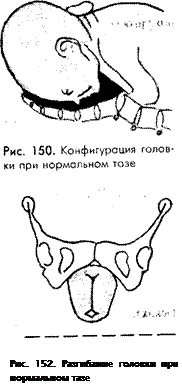 Рис. 145. Нормальный таз: А - головка делит воды на передние и задние; Б - образуется функциональная гидродинамическая по- лость Раздел VI I момент — вставление и мак- симальное сгибание головки пло- да (рис. 147). Головка своим стре- ловидным швом иногда вставляет- ся в поперечный, а в большинстве случаев в косой размер плоскости входа в малый таз. В связи с равно- мерным уменьшением всех разме-