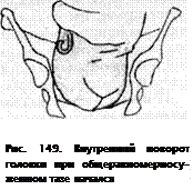Рис. 146. Узкий таз: головка Таз происходит максимальное сги- стоит высоко, не разделяет бание головки до малого косого ВОДЬ! на передние и задние, P A 3 M E P A I м а л ы й родничок опуска- не образует функциональную е т с я к первым, занимает цент- гидродинамическую полость, ральное положение (асинклитизм Редерера) или даже на проводной оси таза (рис. 148). Чем меньше размеры таза и чем длительнее вставление головки в плоскость входа в малый таз, тем более выра- жено изменение формы головки плода. В некоторых случаях родо- вая опухоль головки опускается на тазовое дно, а череп еще находится Рис. 147. Вставление голов- в плоскости входа в малый таз. ки в общеравномерносужен- 11 момент - внутренний пово- ный таз у повторнородящих Р<>т головки плода осуществляется так, как и при нормальных разме- рах таза (рис. 149). Обращает на себя внимание долихоцефалическая форма го- ловки, иногда занимающая все влагалище, опускаясь своей вер- хушкой на тазовое дно, и вызывая ложные потуги (рис. 150,151). III момент — разгибание головки плода происходит не так, как при нормальных размерах таза. При физиологических родах, когда лонный угол прямой, образуется точка фиксации между подзатылочной ямкой и нижним краем симфиза (рис. 152). При общеравномерносуженном тазе лонный угол острый и возника- ет две точки фиксации, вокруг которых и происходит разгиба- ние головки, вследствие чего она отодвигается кзади, повышает давление на промежность и вызывает ее разрывы, (рис. 153). Узкий таз первородящих женщин Рис. 150. Конфигурация голов- ки при нормальном тазе Рис. 152. Разгибание головки при нормальном тазе Рис. 149. Внутренний поворот головки при общеравномерносу- женном тазе начался Рис. 151. Конфигурация голов- ки при общеравномерносужен- ном тазе Рис. 153. Разгибание головки при общеравномерносуженном тазе Слишком согнутая головка, врезываясь и прорезываясь, разги- бается дольше, чем это бывает при нормальных размерах таза, когда она согнута незначительно. Несмотря на то что головка рождается в состоянии максимального сгибания и конфигура- ции, травматизм родовых путей большой, поэтому лучше сделать центрально-латеральную правостороннюю эпизиотомию. IV момент — внутренний поворот плечиков и наружный пово- рот головки плода происходят, как при нормальных размерах таза. Мсф^-^щ^^плоский тш Все размеры общесуженного плоского таза уменьшенные и особенно прямые. Такой таз имеет признаки общеравномерно- суженного и простого плоского таза. Поэтому биомеханизм ро- дов проходит в зависимости от того, признаки какого таза пре- обладают: по типу простого плоского или общеравномерносужен- ного. Головка своим стреловидным швом вставляется в попереч- ный размер плоскости входа в малый таз. При сильном сужении таза происходит асинклитическое вставление и конфигурация головки, как при простом плоском тазе. Прорезывается головка по типу общеравномерносуженного таза с большой травматиза- цией черепа, промежности и прямой кишки. Date: 2015-08-06; view: 1048; Нарушение авторских прав |
