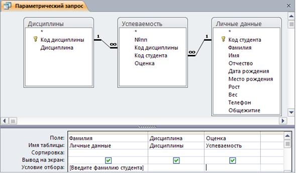 Рис. 3.2. Результат выполнения запроса на выборку 9. Закройте вкладку Запрос1 и сохраните запрос под именем Запрос на выборку. Убедитесь, что созданный запрос появился в категории Запросы. Задание 2. Создать параметрический запрос на выборку следующей информации о студенте: Фамилия, Дисциплина, Оценка. Фамилия студента должна вводиться как параметр в диалоговом окне. Для создания запроса выполните следующие действия. 1. В области навигации перейти в категорию Запросы. 2. На вкладке Создание ленты меню в разделе Запросы нажмите кнопку Конструктор запросов 3. Поместите в бланк запроса следующие поля: Фамилия, Дисциплина, Оценка. 4. Для поля Фамилия в строке Условие отбора: наберите текст в квадратных скобках: [Введите фамилию студента]. Окно конструктора запроса должно выглядеть так, как показано на рисунке 3.3.