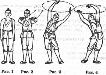 Движения этого комплекса заключаются в очерчивании воображаемого круга, над головой ладонями, обращенными к небу. Пожилые, ослабленные или больные люди, у которых недостаточно сил для выполнения "Небесных кругов", вместо них могут выполнять "Земные круги" (инструкция по выполнению представлена ниже). |1) ПОДГОТОВИТЕЛЬНОЕ ПОЛОЖЕНИЕ: Ноги на ширине плеч, руки опущены свободно по сторонам, пальцы рук вместе (рис. 1). 2) НАЧАЛО: Поднимать руки ладонями вниз и по мере заведения их за голову естественным образом повернуть вверх. Пальцы направлены назад, корпус слегка отклонить также назад и описать круг руками над головой по часовой стрелке 4 раза (рис. 2, 3). Затем 4 раза против часовой стрелки (рис. 4). ЭФФЕКТЫ: С помощью упражнений можно привести в порядок функции легких, сердца, почек и внутренних органов груди, живота и нижней части живота (даосы называют их саньцзяо или «тройной обогреватель»). Они эффективны также для предупреждения и лечения впалой груди, горбатости, головокружения и отвислых грудей у женщин. ОБРАТИТЬ ВНИМАНИЕ: При описании кругов над головой степень наклона туловища выбирать в зависимости от физического состояния занимающегося. Однако необходимо сказать, что чем больше отклонение корпуса в пояснице, тем больший достигается эффект. Когда верхняя часть тела отклоняется назад, центр тяжести перемещается вперед; правильное выполнение движений руками координировать при помощи поясницы; ноги при этом слегка согнуты, чтобы помогать движению туловища; глазами следовать за движением рук, голова и верхняя часть тела также повторяют их движение. Начинающие должны постепенно увеличивать интенсивность нагрузок.