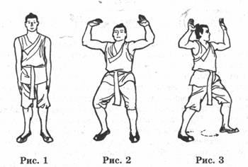 Этот комплекс является вариантом "Небесных кругов" и включает описание пяти кругов обеими руками (1) ПОДГОТОВИТЕЛЬНОЕ ПОЛОЖЕНИЕ; Ноги на ширине плеч» колени слегка согнуты естественным образом, руки свободно опущены по сторонам, мышцы расслаблены, смотреть вперед, спокойно улыбаясь, представляя себя молодым и энергичным (рис. 1). (2) НАЧАЛО: Поднимать руки вперед и вверх ладонями друг к другу. Когда они окажутся над головой (на уровне точки шеньтин) повернуть руки так, чтобы пальцы были направлены наружу, ладоням» вверх (рис. 2). Сместив центр Далее перенести вес тела на правую ногу и повернуть корпус на 90° вправо (рис. 8); подтянуть левую ногу и сделать ею шаг вперед, описав ногой кривую, похожую на "А" (рис. 9). Следующим движением опустить руки вниз по круговым траекториям с обеих сторон и в то же время, согнувшись в пояснице, наклонить верхнюю часть туловища вперед, перемещая вес тела на левую ногу (рис. Ю). Когда руки достигнут верхней части левого колени (точка янгуавь), сложить ладони вместе и начать як поднимать, одновременно с этим вытягивая тело вверх и перемещая его вес на правую ногу (рис.1l). Когда ладони достигнут центра груди (точка шаньчжун), сделать плечами круговое движение назад н повернуть руки, не разжимая ладоней. Фигура, образовании при этом руками, будет похожа на треугольник (рис. 12); Затем развести руки, двигая их но дугам окружности вперед и вверх; наклонить верхнюю часть тела вперед, вес тела сместить на левую ногу, приняв позу "кот в атаке" (рис. 13). Этим завершается передний круг (круг южного направления. Сместив вес тела на правую ногу, подтянуть левую и сделать ею шаг влево, описав над землей иероглиф "Л". Нога возвращается в исходное положение (рис. 14). По дугам окружности опустить руки вниз, согнув при этом тело в пояснице вперед (рис. 15). Когда руки окажутся между внутренними сторонами колея (точка сюэхай), сложить их ладонями вигесте и начать поднимать вверх, вытягивая при этом тело вверх (рис. 16). При достижении сложенными руками центра груди, описать плечами круговое движение назад и, не разжимая ладоней, повернуть руки вверх пальцами, приняв позу молящегося (рис. 17). Затем развести руки вверх в стороны по дугам перед туловищем, подобно нападающему коту (рис. 18). Таким образом завершается центральный круг. Слегка приподняв пятку левой ноги, повернуть ее на 45° влево и сместить центр тяжести тела на левую ногу. При этом произвести поворот тела на 90* вправо (рис. 19). Приставить правую ногу и сделать ею шаг вправо, описав ногой символ "Л"; опустить руки через стороны вниз по дугам окружностей. При этом корпус сгибается в пояснице вперед (рис. 21). Как только руки окажутся над правым коленом, сложить их ладонями вместе и начать двигать их вверх. Вместе с движением рук одновременно вытягивать вверх тело, смещая его вес на левую ногу (рис. 22). Как только руки достигнут Центра груди, сделать круговое движение назад плечами, перевернуть ладони вверх, слегка при этом наклоняя тело вперед, и вес тела перенести на правую ногу (рис. 24). Этим заканчивается правый круг (круг в западном направлении). Приподняв слегка пятку левой ноги, повернуть ее на 45° влево и сместить на нее вес тела (рис. 25). Подтянуть правую ногу и сделать ею шаг вправо, описав "Л" - траекторию. Повернуть корпус на 90°, а пятку левой ноги на 45° (рис. 26). Руки по круговым траекториям опустить