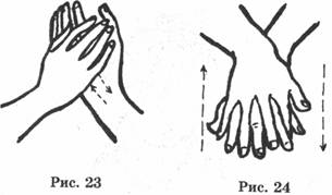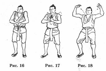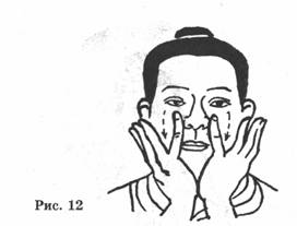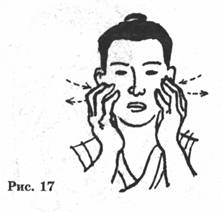 КОМПЛЕКС X. Возвращение облика юности (Омоложение кожи) Основное внимание в этом комплексе уделяется голове и особенно лицу. Длительная практика поможет Вам сделать кожу мягкой, нежной и гладкой, удалить морщины и предупредить появление угрей и возрастных пятен. Комплекс состоит из 14 упражнений. Упражнение I, "К трем звездам" (1) ПОДГОТОВИТЕЛЬНОЕ ПОЛОЖЕНИЕ: Стоять спокойно, слегка улыбаясь; расправить грудь и подтянуть живот, расслабить мышцы, ноги вместе, руки свободно опущены по сторонам. Дыхание медленное и ровное, смотреть прямо вперед, поддерживая расслабленное состояние (рис. 1). (2) НАЧАЛО: Повернув ладони вниз, медленно поднимать руки вперед и вверх над головой (точка шеньтин) (рис. 2). Повернуть ладони вверх так, чтобы наружные стороны рук были обращены друг другу; расслабить запястья, локти, плечи (верхние три сустава) и бедра, колени и лодыжки (три нижних сустава). Слегка приподнять пятки (рис. 3). Когда руки поднимаются (грудь расправлена и втянут живот) вдохнуть как можно больше свежего воздуха (даосы называют вдыхаемый воздух - живительный воздух Вселенной). Дыхание должно быть мягким, поверхностным и беззвучным. Затем, перевернув ладони, медленно вернуть руки в исходное положение по той, ясе траектории (рис. 4). В момент опускания рук производить выдох (даосы называют - выдох-* нута, мертвый воздух). Сделать полный цикл описанных выше движений 3 раза. Даосы называют первое поднятие рук - "к звезде Счастья", второе -"к звезде Благополучия", третье - "к звезде Долголетия". Отсюда название комплекса "К трем звездам"; ЭФФЕКТЫ: Согласно даосской теории при вдохе, когда ладони (точка лаогун) обращены вниз, происходит поглощение земной энергии для питания, придания силы и регуляции кровотока. Когда ладони направлены вверх, они поглощают небесную энергий, при помощи которой можно восстановить; жизненную энергию организма. Длительная практика поможет увеличить жизненную энергию и улучшить; кровообращение таким образом, чтобы они более свободна циркулировали по организму, приведет в равновесие Инь и Ян энергии. Упражнения усиливают кровоток и помогаю» избежать застоя крови. Упражнение 2. "Оттачивание орлиного когтя" (1) ПОДГОТОВИТЕЛЬНОЕ ПОЛОЖЕНИЕ: Встать в положение, описанное в упражнении 1. (2) НАЧАЛО: Продолжить последнее движение'' упражнения 1 (опускание рук). Как только руки начнут приближаться к коленям, сложить их ладонями вместе я поместить между колеи (точки сюехай и цюйцюань); при этом согнуть колени (как бы присесть на корточки) и крепка ежат руки (рис. 5). Затем попеременно поднимать и опускать левую и правую пятки так, чтобы это движение вызывало потирание ладоней между собой до появления в них тепла (рис. 6, 7). Выполнить это упражнение 8 раз. При протираний ладоней друг о друга пальцы должны двигаться от кончиков вальце* другой ладони до ее центра (точка лаогун) и не должны выходить за ладонь. ЭФФЕКТЫ: Это ключевое упражнение данного комплекса. Потирание рук стимулирует точки лаогун, юйцзи, хегу, шисюань и непосредственно оказывает стимулирующее влияние на нервные окончания позвоночного столба. Это упражнение не только повышает гибкость и эластичность суставов пальцев или улучшает кровообращение в руках, но также эффективно для лечения головной и зубной боли, избавляет от потения ладоней, истерии, онемения запястий и рук, грудной жабы.