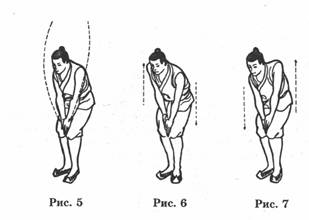 Этот комплекс является вариантом "Небесных кругов". Круги описываются перед грудью, а не над головой. Он рекомендуется пожилым, ослабленным или больным людям. (1) ПОДГОТОВИТЕЛЬНОЕ ПОЛОЖЕНИЕ: Ноге на ширине плеч, руки согнуты перед грудью ладонями вниз (рис. 1). (2) НАЧАЛО: Тело немного повернуть влево, обе руки при этом вытянуть влево и сделать полшага левой ногой также влево. Руки вытягивать» как можно дальше, приняв положение "лучника" (рис. 2). Затем руками перед грудью описать горизонтальный круг но часовой стрелке, изменив положение тела из позиции "лучник", опирающийся на переднюю ногу на "лучник" с опорой на заднюю ногу. Тело при этом слегка поворачивается вперед влево и затем немного вправо с отклонением туловища назад (рис. 3). Повторить круговые движения 8 раз; затем повернуть тело в правую сторону симметрично предыдущему положению и выполнить 8 круговых движений против часовой стрелки (рис. 4, 5). Вместе получается 16-круговых движений. ОБРАТИТЬ ВНИМАНИЕ: Вместе с круговым движением рук перед грудью повторять их поясницей; внимание сконцентрировано на выполнении круговых движений, при этом круги должны описываться как можно точнее. ЭФФЕКТЫ: "Земные круги" являются альтернативными упражнениями по отношению к "Небесным кругам" и поэтому эффекты аналогичные.