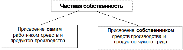 Рис. 1 Типы присвоения собственности Частное присвоение означает, что отдель ные граждане относятся к своему имуществу как к личному источнику богатства. Согласно действующему законодательству физическое лицо вправе по своему усмотрению совершать в отношении принадлежащего ему имущества любые действия, не противоречащие закону и иным правовым актам. Однако оно не должно нарушать права и охраняемые законом интересы других лиц. Частное присвоение имеет два вида, которые существенно различаются между собой: а) собственность на средства производства человека, который сам трудится, и б) собственность на вещественные условия и результаты производства лица, применяющего чужой труд (рис. 2).
