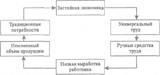 Во-первых, производство товаров основано на общественном разделении труда, которое складывается между отдельными хозяйственным единицами. Здесь важно различать разделение труда на предприятии и в обществе. В первом случае речь идет о таком расчленении коллективного труда, которое происходит во время незавершенного изготовления какой-то части конечного продукта. Только разделение труда между предприятиями (особенное, общее и международное) служит необходимой предпосылкой товарного обмена на рынках. Во-вторых, товарное хозяйство является открытой совокупностью организационно-экономических отношений. Здесь работники создают продукты не для собственного потребления, а для продажи их другим людям. Весь поток новых вещей выходит, как правило, за пределы каждой производственной единицы и устремляется на рынок для удовлетворения спроса покупателей. В-третьих, товарному хозяйству присущи косвенные, опосредованные связи между производством и потреблением. Они развиваются по формуле «производство — обмен — потребление». Изготовленная продукция сначала поступает на рынок для обмена на другие изделия (или на деньги) и лишь затем попадает в сферу потребления. Именно через посредство рыночной торговли устанавливаются экономические отношения между изготовителями и потребителями товаров. Сравнение натурального и товарного производства позволяет выявить достоинства и недостатки каждого из них. Очевидно, что натуральное хозяйство имеет ряд положительных черт: • в нем наиболее просто наложены экономические отношения между • участники хозяйства сами непосредственно решают все организационно-экономические вопросы: что, как (с помощью каких средств и ресурсов) и для кого создавать блага; • замкнутое хозяйство, обладая всеми необходимыми производственными ресурсами, не зависит от неблагоприятных внешних воздействии, в том числе от неустойчивого состояния национальной экономики. Вместе с тем натуральное хозяйство имеет очень значительные отрицательные черты: • в нем преобладает универсальный труд, что неблагоприятно сказывается на совершенствовании факторов производства; • при универсальном ручном труде применяется простейшая техника, что характерно для доиндустриального производства; • работники натурального производства обладают, естественно, низкой выработкой', • для такого производства вполне закономерно повторение производства продукции в прежних размерах, на неизменной основе. Это не обеспечивает рост выпуска благ в расчете на душу населения; • производство не сопровождается увеличением разнообразия видов создаваемых продуктов, что приводит к сохранению на длительный период времени традиционных потребностей. Если попытаться наглядно представить причинно-следственные зависимости между основными признаками натурального хозяйства, то траектория его движения предстанет в виде замкнутого круга экономического застоя (рис. 3). В противовес натуральному производству товарное хозяйство отличается гораздо более значительными положительными признаками: • его развитие основывается на непрестанном развитии всех видов об-щественного разделения труда; • совершенствование специализации труда неразрывно связано с развитием техники и технологии, характерными для индустриального и постиндустриально