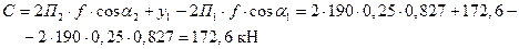 где y 1 и y 2 – сила реакции рельса, действующая соответственно на первую и вторую колесные пары; С – центробежная сила, приложенная в центре тяжести тележки (кН); П 1 и П 2 – нагрузки от колеса на рельс соответственно первой и второй колесной пары (П 1= П 2=190 кН по заданию); f – коэффициент трения колеса с рельсом (принимаем f =0,25); s – половина расстояния между точками контакта колес с рельсами (s =0,8 м).