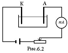 1. Электролитическую ванну наполнить перенасыщенным раствором медного купороса и поместить в нее электроды, согласно схеме (рис.26). 2. Определить массу катода 3. Вставить электроды в ванну. 4.Включить источник тока, установить при помощи реостата ток 300мА и в течение 30 мин. поддерживать постоянную силу тока. 5. По истечении времени выключить источник тока, вынуть из ванны катод, просушить и определить его массу 6. Вычислить по формуле 7. Вычислить по формуле . Контрольные вопросы 1. Какие вещества относятся к электролитам? 2. Напишите уравнения химических реакций, происходящих при электролизе. 3. Какие силы действуют на ион, движущийся в электрическом поле в жидкости? 4. Какая величина называется степенью (коэффициентом) диссоциации электролита? 5. Как изменяется сопротивление раствора электролита при повышении температуры? Поясните ответ. 6. Сформулируйте законы Фарадея для электролиза. 7. Перечислите наиболее важные применения электролиза.