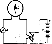 Это свойство магнитной стрелки используется в приборе тангенс-гальванометре для определения Нз. Тангенс-гальванометр представляет собой плоскую вертикальную катушку радиуса R с некоторым числом витков п. Величина радиуса катушки и число витков указаны на тангенс-гальванометре.