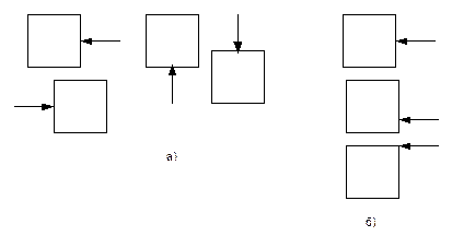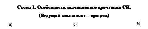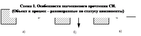 В этом случае ведущим элементом при синтезе, т.е. таким элементом, который определяет контекст прочтения, выступал объект (геометрическая фигура). Теперь рассмотрим вариант, когда ведущим элементом является процесс (см. сх. 6). Характеристика приоритетности графически задается «жирным» изображением ведущего элемента. а) Начало, исходная точка изменения состояния объекта; б) Промежуточная точка процесса изменения состояния объекта; в) Окончание, конечная точка изменения состояния объекта.