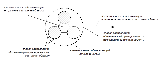 Знак целостности четко отделяет то, что относится к содержанию схемы, и что является вне нее. На схеме «Общая структура схемы.» все, что находится внутри большого круга, относится к объекту, а все, что находится вне него, не относится к объекту, составляет для него внешнюю среду. Стрелка, с одной стороны, прикреплена к объекту, имеет с ним общую точку, а с другой стороны, нарисована вне объекта как принадлежность среды. Такое зарисование и позволяет трактовать ее как что-то принадлежащее объекту проявленное во внешнюю для объекта среду – в данном случае проявленность состояния. Очень часто при зарисовании после введения границ объекта становится необходимым ввести такое усложнение прежнего, которое просто графически не помещается в отведенные границы объекта. Поэтому для удобства зарисования вводится прием рисования вне объекта того, что предполагается внутри него. Но так как онтология требует сохранения целостности объекта при каждом шаге изменения или усложнения, то вводится специальный прием включения нарисованного во вне внутрь объекта за счет охватывающей линии, отходящей от элемента, изображающего целостность объекта (см. сх. 12).
