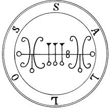 Девятнадцатый Дух зовется САЛЛОС (Sallos) (или САЛЕОС (Saleos)). Он великий и могущественный Герцог, который появляется в образе храброго воина с герцогской короной на голове, сидя верхом на крокодиле, но миролюбивом. Он вызывает любовь женщины к мужчине и мужчины к женщине; и управляет 30 Легионами Духов. Вот его Печать и т.д.