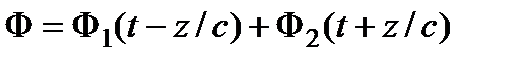 Предположим, что произвольная компонента поля Ф (например, Еα или Вα) зависит лишь от одной пространственной координаты, например z, и времени, т.е. Ф = Ф(z, t). Тогда уравнение упростится и примет вид Формула выражает общее решение уравнения. Она описывает суперпозицию двух волн. Первая из них распространяется вдоль, а вторая – против оси z. Скорости обеих волн одинаковы и равны с. Действительно, возмущение Ф1, находившееся в момент времени t 1 в точке z 1, в момент t 2 приходит в точку z 2, определяемую соотношением t 1 – z 1/ c = t 2 – z 2/ c. Отсюда при t 2 > t 1 имеем z 2 > z 1, и скорость распространения волнового возмущения равна υ = (z 2 – z 1)/(t 2 – t 1) = c. Функции Ф1 = Ф1(z, t) и Ф2 = Ф2(z, t) описывают плоские волны, так как волновое возмущение имеет одно и то же значение во всех точках бесконечной плоскости, перпендикулярной направлению распространения. Конкретный вид функций Ф1 и Ф2 определяется начальными и граничными условиями задачи. Date: 2015-08-06; view: 387; Нарушение авторских прав |