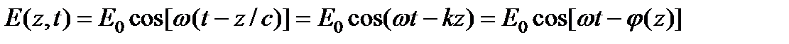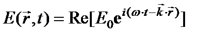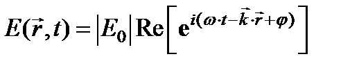 При гармоническом изменении во времени напряженностей электрического и магнитного полей частота остается постоянной. В оптике часто говорят не о гармонической, а о монохроматической волне. Монохроматический означает “одноцветный”. Термин этот возник потому, что в видимом диапазоне глаз реагирует на изменение частоты излучения как на изменение цвета. В дальнейшем для зависимости напряженности поля в волне от координат и времени вместо удобно использовать комплексную запись, принимая во внимание формулу Эйлера