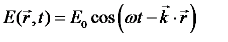 Конкретизируем закон изменения светового поля во времени и в пространстве. Рассмотрим, например, декартову компоненту поля E (z, t). Пусть при z = 0 E (0, t) = E 0cos(wt), т. е. напряженность светового поля изменяется по гармоническому закону. Тогда в соответствии с (1.11) в области с z ≥ 0 будет распространяться плоская гармоническая волна В этом выражении Е 0 – амплитуда волны, w – круговая частота, связанная с периодом Т и частотой колебаний n = 1/ Т соотношениями Геометрическое место точек с одинаковым значением фазы называют волновым фронтом. В плоской гармонической волне волновой фронт представляет собой плоскость, перпендикулярную направлению распространения. Пусть плоская гармоническая волна распространяется в произвольном направлении, задаваемом единичным вектором Вектор