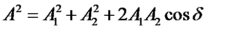 Монохроматическая идеализация оказывается достаточной для решения многих задач. В частности, при изучении явлений интерференции она пригодна для определения положения максимумов и минимумов интерференционной картины. Рассмотрим суперпозицию двух монохроматических волн одинаковой частоты, которые возбуждают в интересующей нас точке пространства колебания одинакового направления с амплитудами А 1 и А 2. Если разность фаз этих колебаний равна d, то возникает результирующее колебание с амплитудой A, которую легко найти с помощью векторной (или фазовой) диаграммы (рис. 1) и теоремы косинусов: