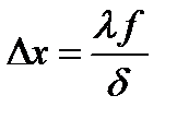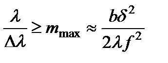 Р и с. 3.9 Ширину D x интерференционной полосы можно найти с помощью формулы D x = l / a, для этой цели она более удобна. Имея в виду, что угол между направлениями распространения двух плоских волн, как видно из рис. 3.9, равен a = d / f, получим: Отсюда следует, что ширина полосы в данном случае не зависит от расстояния между экраном и билинзой. Для подсчета числа полос на экране надо учесть, что зона интерференции здесь имеет вид вытянутого ромба, максимальная ширина х max которого равна половине диаметра D билинзы: x max = D /2. Поэтому важно знать, в каком месте этого "ромба" находится экран. Если он расположен ближе места, где х = x макс (обычно так и бывает), то ширина зоны интерференции на экране будет х = ba = bd / f. И число N возможных полос интерференции окажется N = х /D х, т.е. Остается выяснить дополнительные условия, которым должны удовлетворять ширина s щели S и степень монохроматичности l /D l используемого света, чтобы интерференционную картину можно было получить, причем с достаточно хорошей видностью. Эти условия мы найдем с помощью соотношений h cog ³ 2 d и m» l /D l. Выпишем их для нашего случая, когда щель находится в фокальной плоскости билинзы: