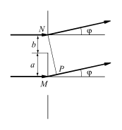Если в непрозрачном экране проделаны две идентичные параллельные щели, то они дадут одинаковые накладывающиеся друг на друга картины, вследствие чего интенсивность каждой точки экрана увеличилась бы вдвое. Такое сложение интенсивностей произойдёт только при некогерентном освещении обеих щелей. При когерентном же освещении необходимо принять во внимание взаимную интерференцию волн, дифрагировавших на обеих щелях, что приведёт к более сложному распределению интенсивностей на экране. Найдём это распределение. Пусть обе щели имеют ширину b, разделены непрозрачным промежутком a, так что a + b = d. Очевидно, что дифракционные минимумы будут на прежних местах. где m = ±1, ±2, … Ибо те направления, по которым ни одна из щелей не посылает света, не получат его и при двух щелях. Кроме того, возможны направления, по которым когерентные колебания, посылаемые двумя щелями, взаимно гасят друг друга. В этом случае говорят об интерференционных минимумах. Такие направления определяются, как видно из рис. 4.24, условием т.е. этим направлениям соответствуют главные интерференционные максимумы.