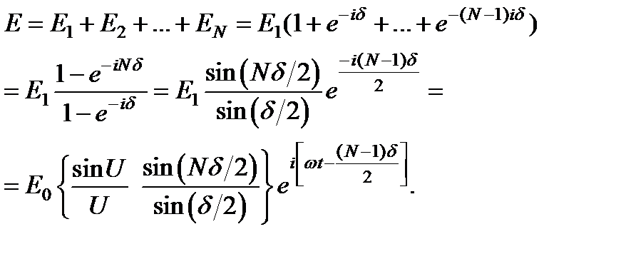 Исследование дифракции на двух щелях показывает, что в этом случае дифракционные максимумы становятся более узкими, чем в случае одной щели. Увеличение числа щелей делает это явление ещё более отчётливым. Рассмотрим сейчас правильную структуру, состоящую из множества (до сотен тысяч) одинаковых равноотстоящих параллельных щелей, сделанных в непрозрачном экране. Такая структура называется дифракционной решёткой. Пусть дифракционная решётка имеет N щелей, ширина каждой из них b, промежуток между щелями a, период решётки d = a + b. В решётке осуществляется многолучевая интерференция дифрагированных пучков света, исходящих от щелей решётки при ее когерентном освещении. Дифракционная картина наблюдается по методу Фраунгофера, т.е. либо на бесконечно удалённом экране, либо в фокальной плоскости линзы, поставленной на пути дифрагированного света. Найдем в этой случае распределение интенсивности по углам дифракции j. Предположим, что на решетку перпендикулярно к ее поверхности падает плоская монохроматическая волна (рис. 4.26). Разность хода между дифрагированными волнами, исходящими из соседних щелей решетки, будет D = d sin j, а разность фаз – d = k D = kd sin j, где j – угол дифракции. Обозначим, как и раньше, через E 1, возмущение, создаваемое в точке наблюдения первой щелью. Оно определяется формулой Возмущения, создаваемые остальными щелями, представятся выражениями: