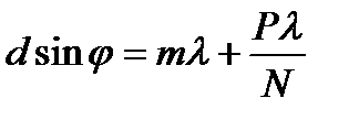 Выделим комплексную амплитуду А суммарного возмущения Определим искомую интенсивность дифрагированного света как Третий сомножитель в определяет интерференцию параллельных пучков без учета дифракции (рис. 4.27б). Из него следуют условия главных максимумов и дополнительных интерференционных минимумов: m = 0, ±1, ±2, …; P = 1, 2, …, N – при каждом значении m) График распределения пронормированной к единице относительной интенсивности, определяемой соотношением, представлен на рис. 4.27в. Формулы – – основные в теории дифракционной решетки.