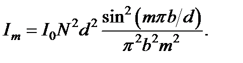Анализ этой формулы приводит к следующим выводам: 1. Интенсивность в главных максимумах в N 2 раз превосходит интенсивность, создаваемую по этим направлениям одной щелью. 2. Im ~ 1/ m 2, т.е. с увеличением порядка максимума резко уменьшается его интенсивность. 3. Интенсивность в m -ом максимуме существенно зависит от отношения b / d. При (b / d) m= Из выражения следует, что между двумя главными максимумами должно возникать (N – 1) интерференционных минимумов, когда sin(Nd /2) = 0, а sin(d /2) ¹ 0, что и определяет условие минимумов. Между этими минимумами должны находится побочные, или дополнительные максимумы, в которых интенсивность света при достаточно большом N пренебрежимо мала по сравнению с интенсивностями главных максимумов. Согласно формулам и угловое расстояние D j между любым главным максимумом и соседним минимумом определяется из требования, чтобы разность хода возросла на l / N, т.е. D(d sin j) = l / N, откуда d cos j ×D j = l / N, так что D j = l /(Nd cos j). При не очень больших углах дифракции (cos j»1) резкость главных максимумов не зависит от порядка спектра и равна Из формулы следует, что резкость главных максимумов тем больше, чем больше Nd, т.е. чем больше общая ширина решетки. При заданном периоде решетки d резкость главных максимумов возрастает (D j уменьшается) с ростом числа штрихов N.