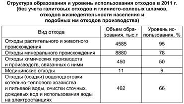 Уровень использования отходов без учета галитовых отходов и глинисто-солевых шламов составил 77% (в среднем) (табл.). Наиболее полно утилизируются отходы растительного и животного происхождения (95%) за счет переработки отходов производства вкусовых продуктов, обработки и переработки древесины, бумаги и картона.