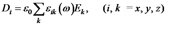 Cоотношения и получены на основе уравнений Максвелла без каких бы то ни было предположений о свойствах среды. Чтобы продвинуться дальше, необходимы материальные уравнения, связывающие и в рассматриваемой среде. В анизотропной среде поляризованность , в общем случае не совпадает по направлению с создающим ее электрическим полем . Поэтому не совпадают и направления и , т.е. в материальном уравнении, связывающем и в монохроматической волне, диэлектрическая проницаемость представляет собой тензор второго ранга: .
