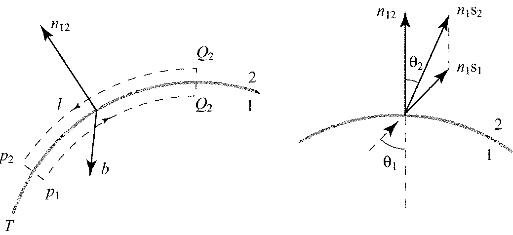 Р и с. 7.1 где его направление перпендикулярно градиенту показателя преломления. Искривлением лучей света в неравномерно нагретом воздухе объясняется явление миража, когда в жаркой пустыне возникает иллюзия находящейся на горизонте водной глади или вдали на асфальте нагретого солнечными лучами шоссе видны «лужи», исчезающие при приближении к ним. Прилегающие к раскаленной земле слои воздуха нагреты сильнее, поэтому плотность воздуха и его показатель преломления возрастают с высотой. Лучи света, входящие в такой слой под небольшими углами, искривляются и, не достигнув земли, выходят обратно под такими же углами. Мы настолько привыкли к прямолинейному распространению света, что подсознательно считаем источник расположенным на прямолинейном продолжении попадающих в глаз лучей даже тогда, когда они искривлены; мы видим расположенные над горизонтом удаленные предметы как бы отраженными горизонтальной зеркальной поверхностью («водной гладью»). Другой пример искривления лучей дает явление астрономической рефракции, обусловленное тем, что плотность земной атмосферы и, следовательно, ее показатель преломления убывают с высотой. Наблюдаемая высота небесного светила над горизонтом оказывается больше истинной. Эффект особенно значителен, когда светило наблюдается у горизонта (рефракция при этом достигает 35') и быстро убывает с увеличением высоты. Этим объясняется сплюснутая форма солнечного диска при восходе и закате. Благодаря рефракции мы видим Солнце в течение нескольких минут после того, как оно уже зашло. Выше предполагалось, что показатель преломления представляет собой непрерывную функцию координат. Чтобы рассмотреть поведение лучей при переходе через резкую границу раздела сред с различными показателями преломления, можно мысленно заменить граничную поверхность тонким переходным слоем, в котором показатель преломления изменяется непрерывно. Тогда уравнение останется в силе. Применяя к обеим его частям операцию rot и учитывая тождество rot(grad(S)) = 0, находим соотношение, которому должен удовлетворять лучевой вектор Выберем небольшой прямоугольный контур