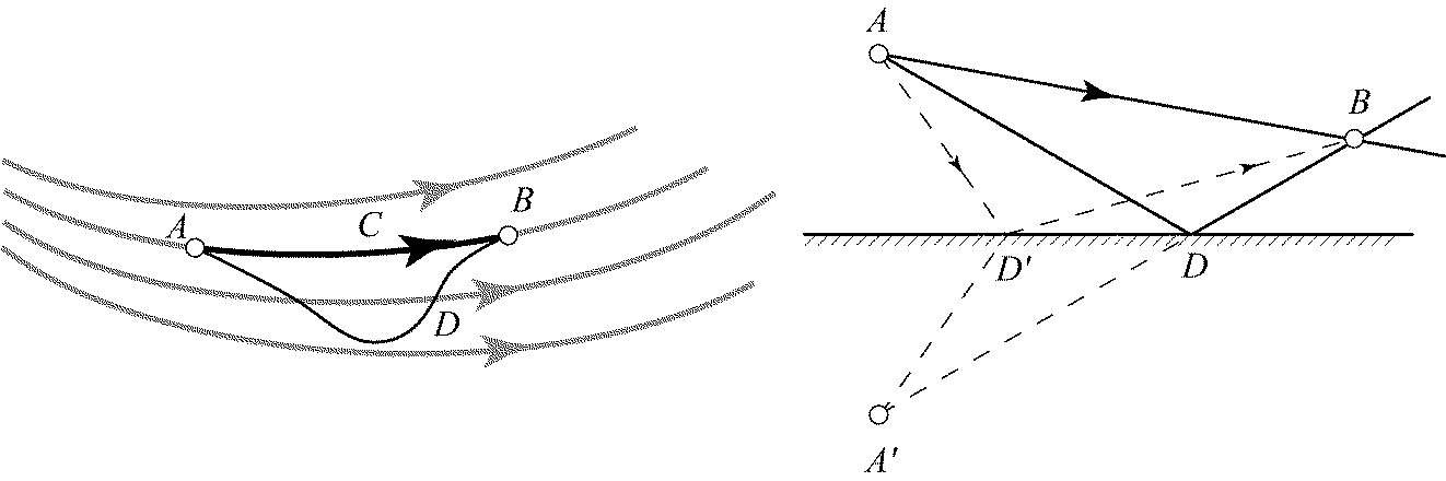 где Нахождение траекторий лучей света в приближении геометрической оптики можно сформулировать как задачу вариационного исчисления, если воспользоваться принципом Ферма, согласно которому свет распространяется между двумя точками по такому пути, который требует для прохождения наименьшего времени. Принцип наикратчайшего оптического пути, сформулированный Пьером Ферма в середине XVII в., можно получить как следствие основного уравнения геометрической оптики. Рассмотрим некоторую область с показателем преломления