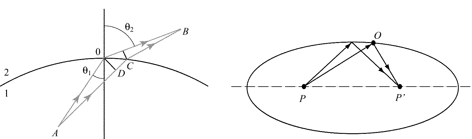 а) б) Р и с. 7.3 причем знак равенства справедлив только в том случае, когда направления векторов В приведенном выше доказательстве было использовано предположение о том, что через каждую точку рассматриваемой области проходит только один луч. Это условие во многих практически важных случаях не выполняется. Например, при отражении от зеркала света, испускаемого точечным источником А, через любую точку В проходят два луча (рис. 7.3 б). Чтобы охватить подобные случаи, принцип Ферма можно сформулировать в более слабой форме, но применимой в более широкой области: реальный луч отличается от остальных кривых, соединяющих две заданные точки, тем, что соответствующая ему оптическая длина имеет стационарное значение, т. е. малое изменение траектории (например, точки падения на зеркало; рис. 7.3 б) не приводит в первом порядке к изменению оптической длины. Эта формулировка вполне достаточна для практических приложений, ибо для нахождения луча можно ограничиться сравнением оптических длин для воображаемых путей, которые проходят бесконечно близко от действительного. Проиллюстрируем применение принципа Ферма на примере преломления луча на границе однородных сред. Пусть АОВ – истинный путь света из A в B (рис. 7.4). Тогда при малом изменении траектории – смещении точки преломления из O в C – оптическая длина в первом приближении должна остаться неизменной. Оптический путь в среде 1 увеличивается на n 1| DC | = n 1| OC |sin q 1, в среде 2 – уменьшается на n 2| OE | = n 2| OC |sin q 2. Приравнивая эти величины, опять получаем закон преломления: Если пучок лучей, выходящих из какой-либо точки P, после отражений, преломлений на границах или искривлений в неоднородной среде сходится в точке Р ', то Р' называется действительным фокусом геометрического схождения лучей. Его можно рассматривать как оптическое изображение точки Р. Изображение называют мнимым, если в Р' пересекаются не сами лучи, а их продолжения, проведенные в направлении, противоположном распространению света. Если источник Р и его изображение Р' поменять местами, то форма всех лучей останется без изменения и лишь их направление изменится на противоположное (принцип обратимости). Поэтому точки Р и Р ' называются сопряжёнными. Когда все лучи пересекаются строго в одной точке Р' – изображение называется стигматическим (точечным). Пучок лучей, выходящих из одной точки или сходящихся в одну точку, называется гомоцентрическим. В соответствии с принципом Ферма оптическая длина всех лучей между сопряженными точками одинакова. В качестве примера рассмотрим зеркало в форме эллипсоида вращения (рис. 7.5). Сумма расстояний | РО |+| ОР '| от его фокусов до точки О имеет одно и то же значение при любом положении точки О на его поверхности. Если в один из фокусов поместить точечный источник, в другом фокусе пучок отраженных от зеркала лучей образует стигматическое изображение источника. Исходящие из фокуса эллипсоида гомоцентрические пучки лучей в результате отражения превращаются снова в гомоцентрические. Совершенно аналогично в фокусе параболического зеркала образуется стигматическое изображение находящегося на оси параболоида бесконечно удаленного точечного источника (параболоид можно рассматривать как предельный случай эллипсоида, когда второй его фокус удаляется в бесконечность). Такие параболические зеркала ис