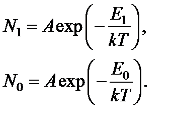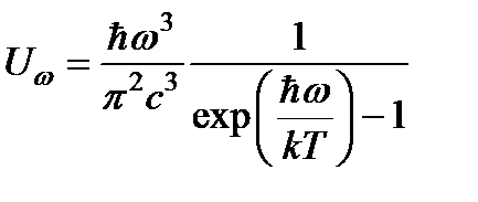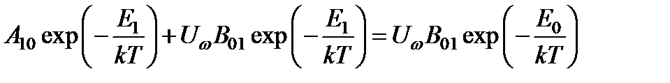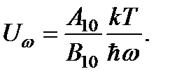 В 1917 г. А. Эйнштейн (1879-1955) предложил элементарную квантовую картину динамического равновесия между излучением и материальной средой, приводящую к правильной формуле излучения абсолютно черного тела. Обозначим А 10 вероятность спонтанного перехода 1 ® 0 в секунду, N 1- концентрацию атомов на верхнем уровне. По определению этих величин можно записать Частота вынужденных переходов, очевидно, пропорциональна плотности излучения. Обозначим В 10 и В 01 вероятности вынужденных переходов 1 ® 0 и 0 ® 1 в секунду, отнесенные к спектральной плотности излучения ww; N 0 - концентрацию атомов на нижнем уровне. По определению этих величин можно записать С учетом и соотношение принимает вид В равновесном состоянии справедливо распределение Больцмана, которое для концентраций атомов принимает вид где A – нормировочная постоянная. Подставляя в и сокращая полученное выражение на общий множитель A, находим Величины A 10, В 10, B 01 называют коэффициентами Эйнштейна. Из физических соображений ясно, что при T ® ¥ должно быть Uw ® ¥. Тогда, разделив обе части на Uw, получим Поэтому соотношение может быть записано в виде где Сравнивая с формулой Рэлея-Джинса, находим
