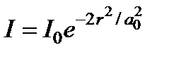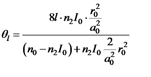 Возводя это выражение в квадрат, определим Подставим в значение показателя преломления из, предварительно разложив его в ряд и ограничившись двумя первыми членами так что Из анализа выражения видно, что угол отклонения луча зависит от координат его точки падения (r 0) на поверхность слоя. Луч, падающий вдоль оси Oz, не испытывает углового смещения, тогда как луч с координатой r 0 = a 0 испытывает максимальное угловое смещение Качественный анализ полученного выражения позволяет нам сделать вывод о том, что увеличить угол расходимости пучка можно двумя способами: 1) увеличением интенсивности падающего пучка I 0; 2) уменьшением a 0, т.е. первоначальной фокусировкой падающего пучка.