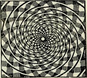 6. Иллюзия концентрических окружностей. Представленные на рисунке концентрические окружности воспринимаются как спираль из-за того, что короткие отрезки прямых (изображены белым) пересекают эти окружности в местах их пересечения с фоном (Е).