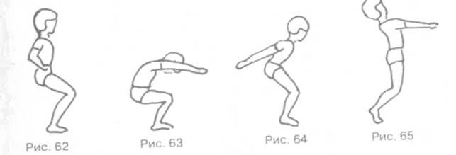 Полуприсед — приседание, выполненное на половину амплитуды (рис. 62). Круглый полуприсед — полуприсед на носках, колени вместе, туловище согнуто вперед, голова опущена, руки вверху расслаблены (рис. 63). Полуприсед с полунаклоном — руки обычно отведены назад. Часто это положение называют «старт пловца» (рис. 64). Наклонный полуприсед — полуприсед, при выполнении, которого бедра, туловище и голова расположены по одной прямой линии и наклонены назад, руки вперед (для удержания равновесия). Обычно выполняется на носках (рис. 65).