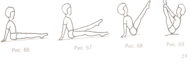 «Волна» туловищем с движением рук вниз-назад и вверх. Обычно выполняется из круглого полуприседа, последовательно вынося вперед колени, бедра и грудь (волнообразно разгибая позвоночник), расслабленные руки сначала падают вниз, а затем, в конце движения волны, поднимаются вверх, одновременно с отведением головы назад. Все движения выполняются слитно с акцентом в конце. Седы Сед — положение занимающегося сидя на полу или на снаряде с прямыми ногами, руки вдоль тела касаются опоры у таза или чуть-чуть отставлены назад (рис. 66). Иное положение рук указывается дополнительно, например: сед руки вперед. Сед ноги врозь — сед с разведенными врозь ногами на ширину плеч (рис. 67).