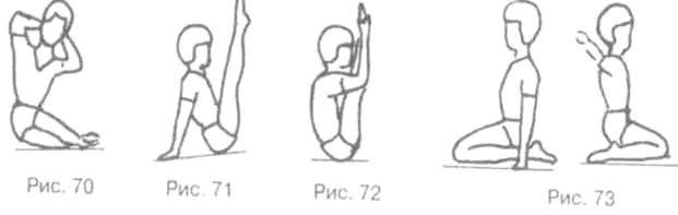 Сед на пятках с наклоном — в седе на пятках туловище наклонено вперед до касания руками пола, руки вверху (рис. 74). Сед на левой (правой) пятке с наклоном — обязательно указывается название ноги, на которой выполняется сед, вторая нога прямая впереди (рис. 75). Если свободная нога имеет другое положение, то об этом необходимо указать дополнительно. Например: сед на левой пятке с наклоном, правая полусогнута впереди на носке, руки назад (рис. 76). Сед с наклоном и захватом — аналогично положению седа с наклоном, но руки захватывают голень снаружи и притягивают туловище к ногам (рис. 77).