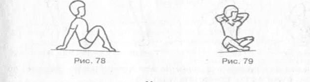 Сед согнув ноги — в положении сидя ноги максимально согнуты, оттянутые носки касаются пола, руки слегка отставлены назад (рис. 78). Сед согнув ноги скрестно — в положении сед согнув ноги голени скрестно, колени слегка разведены (рис. 79). Положение рук, если они не внизу, указывается дополнительно.