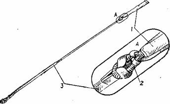 Присоединяют конец с малой петлей звена купола (рис 3.27) к пучку строп на полюсном отверстии купола, конец с большой петлей пропускают через чехол купола и коуш вытяжного парашюта. Надевают большую петлю звена купола на сложенный вытяжной парашют и получившийся в результате этого узел-удавку затягивают на его коуше. Устанавливают кольцо звена ручного раскрытия в карман на левом соединительном ремне, а его трос с петлей продевают в шланг. Выравнивают плечевые обхваты на одинаковый размер и проверяют исправность замков ОСК и парашютной сумки.