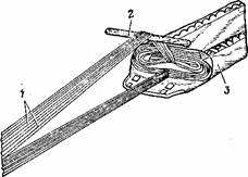 Закрепляют вершину купола основного парашюта на укладочном полотнище с помощью металлического костыля. Разделяют стропы правой и левой групп и левую половину купола перебрасывают на правую сторону. Берут 14-ю стропу у кромки купола в левую руку, 15-ю стропу в правую руку. Растягивают полотнище, заключенное между 14-й и 15-й стропами, на всю длину по радиальным швам и перебрасывают правой рукой через верх справа налево, перекладывают 15-ю стропу в левую руку, а правой берут 14-ю стропу и т. д. Действуя в указанной последовательности, укладывают купол до 21-й стропы. Берут 21-ю стропу, выбирают слабину клапана до его натяжения и, захватив стропу управления этого клапана вместе с 22-й стропой, перебрасывают полотнище таким образом, чтобы все стропы звена управления разместились в 21-м полотнище. При дальнейшей укладке необходимо помнить, чтобы полотнища, заключенные между 26, 27, 28, 1, 2 и 3-й стропами, не должны провисать и иметь одинаковое натяжение с другими полотнищами. Укладывая второй клапан и его звено управления, выбирают слабину клапана, захватывают его вместе с 8-й стропой и стропой управления и укладывают в 7-е полотнище так, чтобы все стропы звена управления оказались в этом полотнище. Заканчивается укладка полотнищ разравниванием 14-го полотнища, при правильной укладке 14-я стропа должна оказаться сверху. Переворачивают купол и кладут его 14-м полотнищем и 14-й стропой вниз. Раскладывают купол на две половины, при этом марка завода-изготовителя на куполе должна находиться с правой стороны (рис. 3.28). Подтягивают стропы, выравнивают и разделяют их на правую и левую группы. Стропы управления на месте входа их внутрь купола разводят в стороны на 40-50 мм. Заворачивают кромку правой половины купола, выравнивают, слабину клапана выбирают и укладывают его между полотнищами, аналогично выравнивают кромку левой половины купола. Выровняв кромки купола, полотнища правой и левой половины купола подгибают по всей длине на ширину чехла и накладывают грузики по всей длине купола. Проверяют звено купола и, убедившись, что оно не перекручено, на вершину купола надевают чехол, при этом петлю из красного шнура, пришитую на кромке полюсного отверстия купола, совмещают с уздечкой полюсного отверстия купола и надевают их на костыль, которым крепится укладочное полотнище. Отворачивают основу фартука чехла. Берут основу чехла (рис. 3,29) за нижнюю часть и, снимая грузики, натягивают чехол на купол до меток 1, расположенных на расстоянии 350 мм от нижней кромки купола.