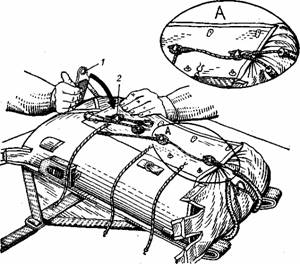 Временно связывают концы тесьмы-завязки на верхнем клапане и тесьмы-завязки кармана ППК-У-405А. Зажимают крючки ранцевых резин в проволочных петлях на клапанах ранца, резины продевают в шлевки и застегивают на дне ранца, при этом застежка ранцевых резин верхнего клапана производится в последнюю очередь. Заправляют конец шланга и часть чехла, надетого на шланг, под правый боковой клапан. Заправляют вытяжное звено под верхнюю и нижнюю ранце вые резины на правом боковом клапане и контрят его для чего промежуточную петлю связывают с кольцом, закрепленным на правом клапане, контровочной нитью в два сложения. Укладывают карабин вытяжного звена в карман на правом боковом клапане ранца. При контроле четвертого этапа проверяются: