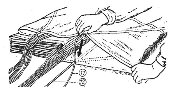 Порядок выполнения элементов этапа Укладывающий берет стропу № 12 и, удерживая ее на середине укладочного полотнища, перебрасывает купол на правую сторону укладочного полотнища. Берет петлю стропы № 13 и накладывает на петлю стропы № 12, нижнюю кромку, заключенную между ними, складывает вдвое и растягивает перпендикулярно стропам, при этом помогающий разравнивает полотнище от нижней кромки до вершины купола. Укладывающий захватывает петлю стропы № 14, накладывает на петлю стропы № 13, помогающий разравнивает полотнище до вершины. В таком порядке укладывают всю левую половину купола до стропы № 24 (рис. 4.2). На уложенный купол кладут грузики.