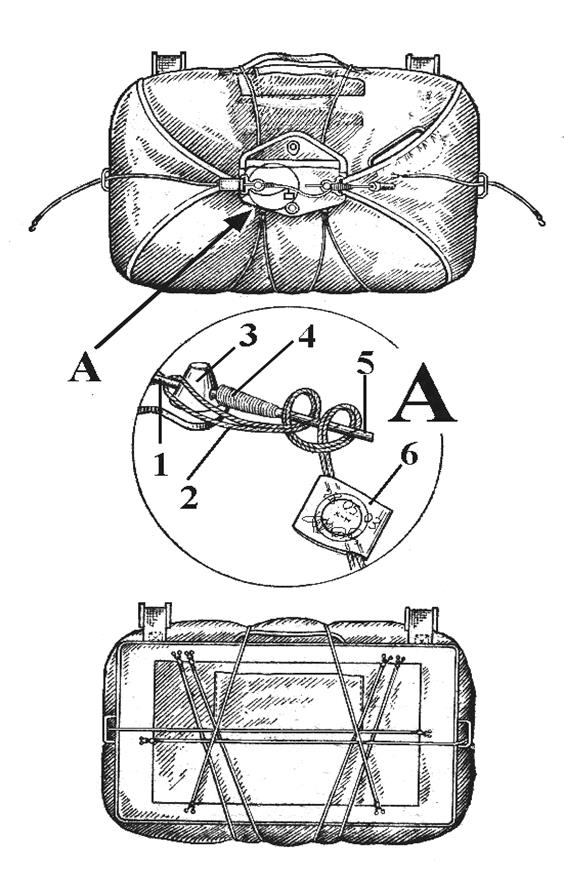 Прижимают уложенный купол сверху рукой и накладывают на него верхний клапан (рис. 4.8, а) с двумя конусами. Надевают нижний клапан люверсами на конусы верхнего клапана, в конусы вставляют вспомогательные шпильки (рис. 4.8, б), при этом купол должен размещаться в ранце равномерно. Накладывают левый боковой клапан, его пряжку-люверс надевают на левый конус, т.е. на люверс нижнего клапана. Вынимают из конуса вспомогательную шпильку и вместо нее вставляют вторую шпильку троса звена ручного раскрытия (рис. 4.8, в). Аналогичным способом затягивают правый боковой клапан и вставляют в конус первую шпильку троса звена ручного раскрытия. Выбирают излишнюю слабину троса и через шланг заправляют его в карман кольца. Расправляют карманы клапанов (рис. 4.8) и с помощью укладочной линейки осторожно, чтобы не повредить ткань купола и не нарушить укладку строп, заправляют внутрь ранца. Расправляют карман кольца и заряжают ранцевые резины. Контрят первую шпильку троса звена ручного раскрытия (5) контровоч-ной нитью № 30 (2) черного цвета (рис. 4.9). Для этого складывают нить вдвое, надевают образовавшуюся петлю на конец шпильки, который выходит из конуса (3). Прокладывают концы нити вдоль шпильки и завязывают их вокруг троса простым тройным узлом в том месте, где начинается опайка (4) этой шпильки. Перегибают бумагу (6) так, чтобы получился квадрат 30х30 мм, вкладывают концы нити в бумагу с печатью и датой укладки. Бумагу складывают пополам и склеивают. Элементы контроля 5-го этапа: - правильность выхода свободных концов промежуточной подвесной