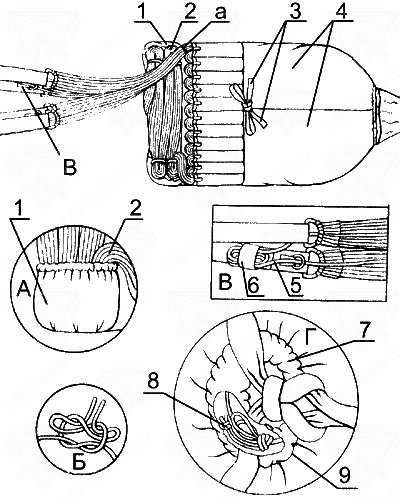 Закройте пучки строп, уложенные в соты, карманами (рис.39, А). Проверьте стропы, уложенные в соты камеры, обращая внимание на то, чтобы пучки строп прижимались резиной, а размер строп, не уложенных в соты, не превышал 0,4 м, т. е. стропы должны быть уложены в соты до имеющихся на них меток (рис. 39). Закройте фартуками верхнюю часть сот и выходящие из них пучки строп и свяжите фартуки имеющимися на них лентами-завязками простым легко развязывающимся узлом (рис.39, Б), На рис.39, Б узел для наглядности показан незатянутым.