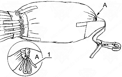 ПРЕДУПРЕЖДЕНИЕ. КОНТРОВКА КОЛЕЦ ПЕРЬЕВ СТАБИЛИЗАТОРА С КОЛЬЦАМИ КАМЕРЫ СТАБИЛИЗИРУЮЩЕГО ПАРАШЮТА ПРОИЗВОДИТСЯ ТОЛЬКО КОНТРОВОЧНЫМ ШНУРОМ ШХБ-20 ДЛИНОЙ 0,3 м, ПРИЧЕМ: - ПРИ УКЛАДКЕ ПАРАШЮТНОЙ СИСТЕМЫ ДЛЯ ПРЫЖКОВ ИЗ САМОЛЕТОВ АН-12, АН-22, АН-26 И ИЛ-76 ПРИМЕНЯЕТСЯ ОДИН КОНТРОВОЧНЫИ ШНУР ДЛИНОЙ 0,3 м (рис. 44, А); Уложите мелкими пучками в камеру вначале стропы, затем нижнюю кромку купола, его основу и вытяжное устройство.